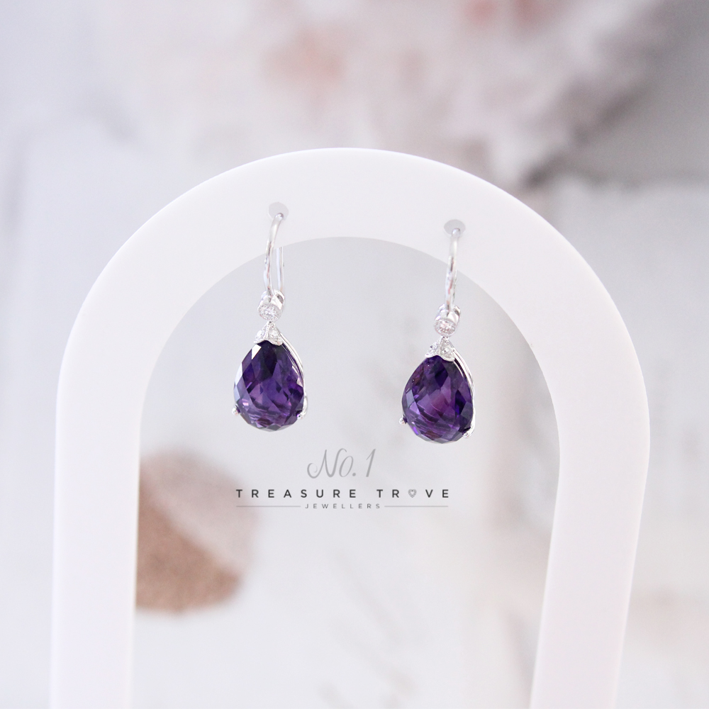 Pair of drop earrings by Luke Stockley London. Pear cut facetted amethysts measuring approximately 13mm x 8mm with a two diamond set cap and suspended from a single brilliant cut diamond weighing an estimated 0.04ct. All 18ct white gold with shepherds crook fittings. Fully hallmarked and signed Luke Stockley London. Gross weight of pair 3.3g.