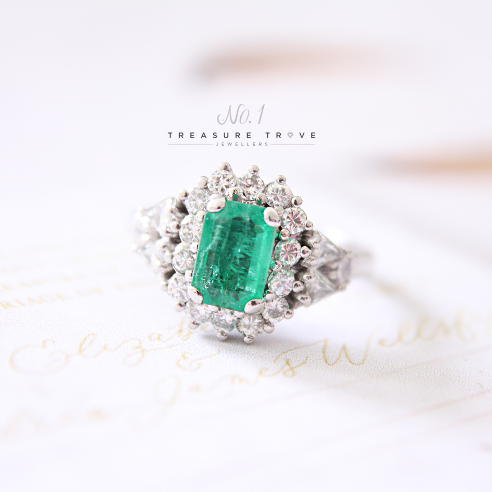 Fancy cluster ring set with bright green trap cut emerald weighing approximately 1.10cts. Surrounded by 14 brilliant cut diamonds with two trilliant cut diamonds and a single brilliant cut diamond set on each shoulder. Total diamond content estimated as 0.75ct. Mounted on an 18ct white gold shank, finger size M, with platinum claw settings. The cluster measures 13mm x 9.35mm not including the shoulders. No hallmark but tested to confirm. Weight 5.3g.