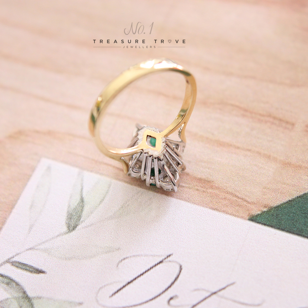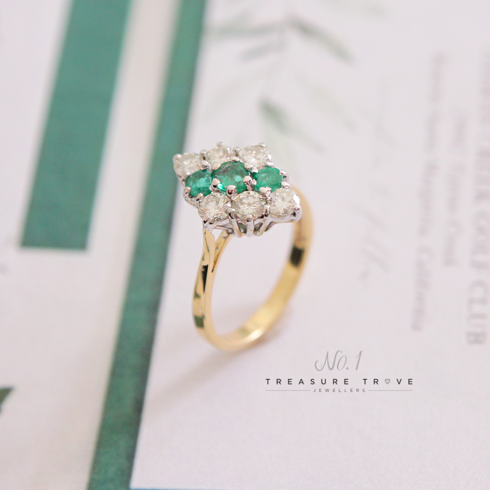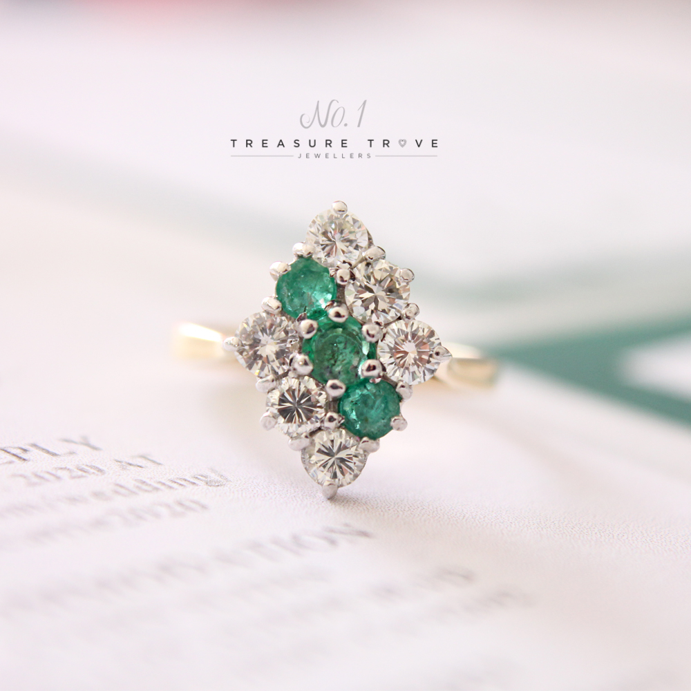 Extremely pretty 1970’s marquise shape cluster ring set with three round mixed cut emeralds to the centre, set diagonally with a row of three brilliant cut diamond set diagonally above and below. Each diamond weighs an estimated 0.115ct with a total diamond weight estimated at 0.70ct. Colour estimated as I/J. Clarity estimated as SI1. Overall the cluster measures 12mm x 14mm. Mounted in 18ct yellow gold with high basket white gold claw settings. Fully hallmarked London 1975. Finger size K.