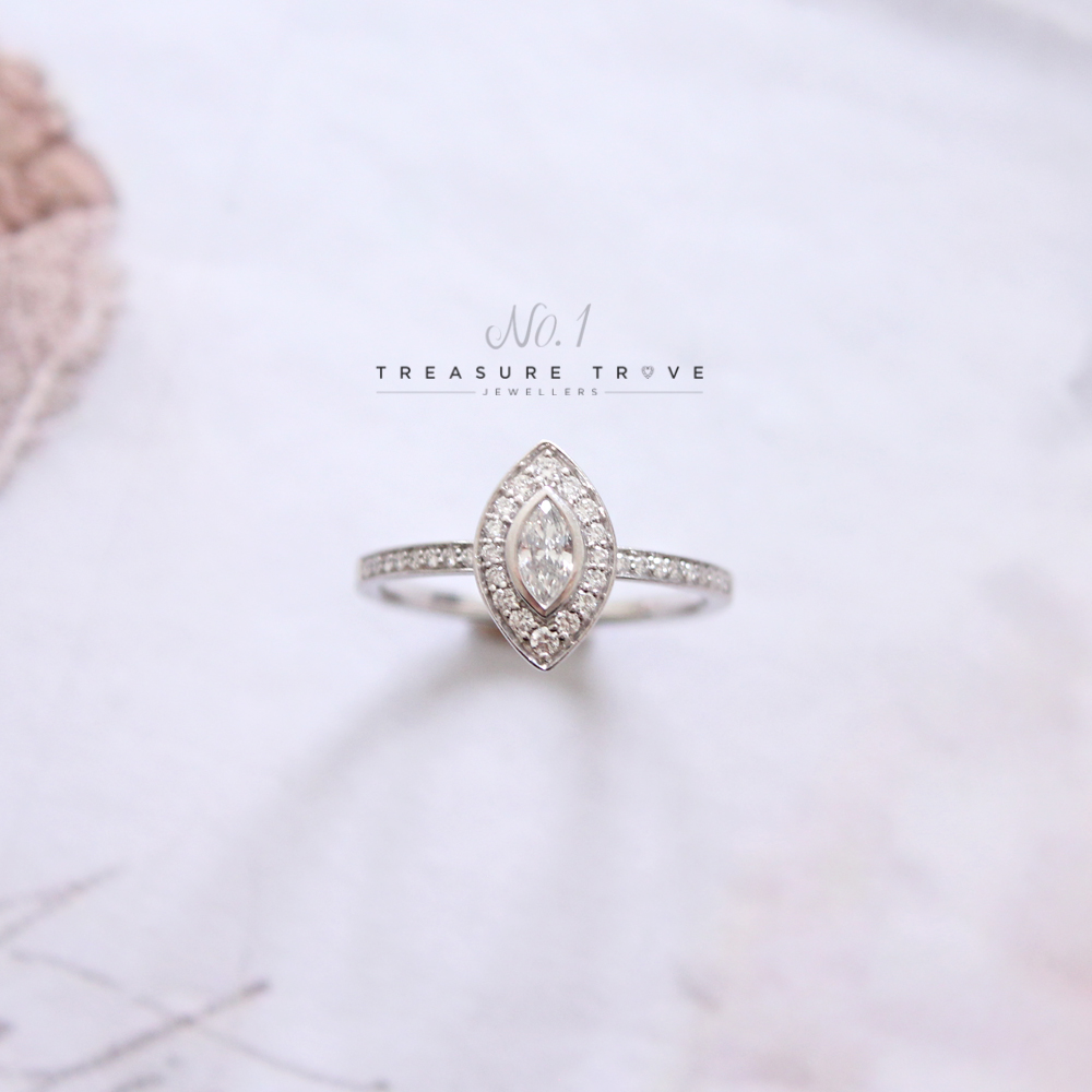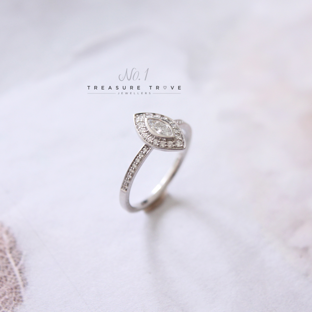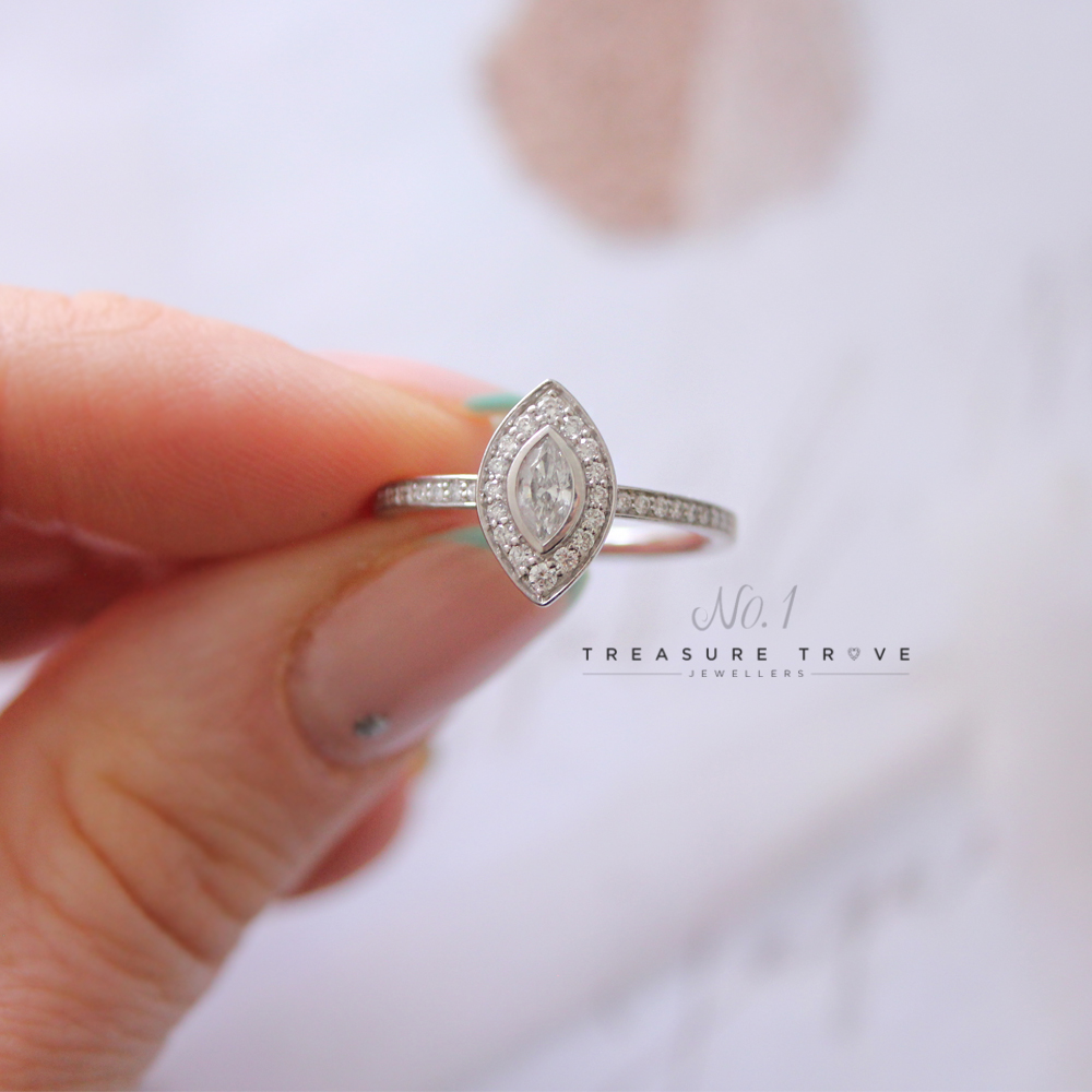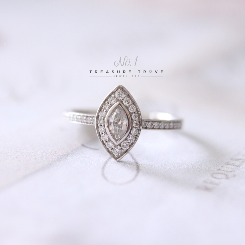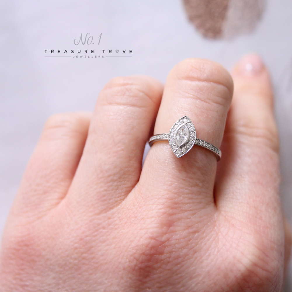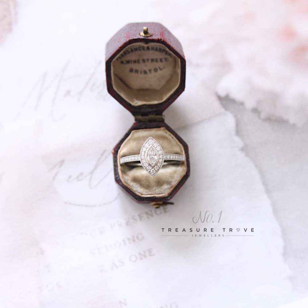 Marquise diamond cluster ring set with a central marquise cut diamond weighing an estimated 0.35ct with a surround of sixteen brilliant cut diamonds and having 8 brilliant cut diamonds set into each shoulder. Total diamond content estimated as 1.00ct. Mounted in all platinum with rub over setting to the marquise and grain settings to the brilliant cut diamonds. Fully hallmarked, finger size P. Cluster measures 12mm x 7.5mm.